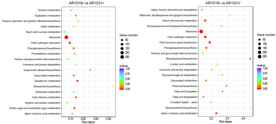 In the KEGG pathway-enrichment analysis, matches were found for 2119 and 2287 unigenes, which mapped onto 113 and 117 KEGG pathways in the AR1018r vs. AR1031r comparison and the AR1018y vs. AR1031y comparison, respectively. According to the KEGG pathway database, the main enriched metabolic processes were ribosome, glutathione metabolism, amino sugar and nucleotide sugar metabolism, beta-alanine metabolism, and phenylpropanoid biosynthesis in the AR1018r vs. AR1031r comparison; the main enriched metabolic processes were monoterpenoid biosynthesis, plant hormone signal transduction, ribosome, plant–pathogen interaction, phenylpropanoid biosynthesis, alpha-linolenic acid metabolism, and flavonoid biosynthesis in the AR1018y vs. AR1031y comparison (Figure 9).