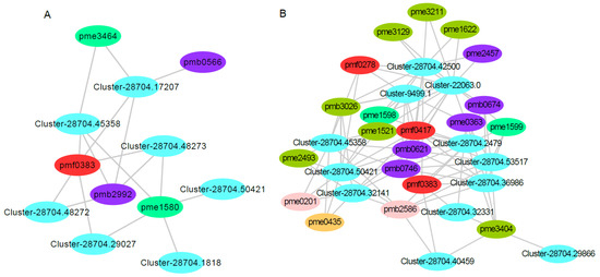 Correlation analysis of the transcriptomic and metabolomic data for red and yellow leaf coloring in red maple. Note: (A) the connection network between the DEGs and DAMs that mapped onto flavonoid metabolism in the red-strain red maple. Pmf0383, pmb2992, pme3464, pme1580, and pmb0566 are the metabolites of ‘5,7-dihydroxy-3′,4′,5′-trimethoxyflavone′, acacetin O-glucuronic acid, isosakuranetin (4′-Methylnaringenin), eriodictyol, and luteolin O-hexosyl-O-pentoside, respectively. (B) The connection network between the DEGs and DAMs that mapped onto flavonoid metabolism in the yellow-strain red maple. Pmb0621, pmb2586, pmb3026, pme1521, pme1598, pme1622, pme2457, pme3129, pme3211, pme3404, pmf0278, pmf0417, pmb0674, pmb0746, pme0201, pme0363, pme0435, pme1599, pme2493, and pmf0383 are the metabolites of C-hexosyl-isorhamnetin O-hexoside, Gallocatechin-catechin, Quercetin O-acetylhexoside, Dihydroquercetin (Taxifolin), Hesperetin 5-O-glucoside, Kaempferol 3-O-glucoside (Astragalin), Luteolin 7-O-glucoside (Cynaroside), Quercetin 4′-O-glucoside (Spiraeoside), Quercetin 3-O-glucoside (Isotrifoliin), Syringetin, Gossypitrin, Eriocitrin, C-pentosyl apigenin O-salicyloyl hexoside, Tricin 4′-O-β-guaiacylglycerol, Catechin, Chrysoeriol, Procyanidin B2, 7-O-Methyleriodictyol, Kaempferol 3,7-dirhamnoside (Kaempferitrin), and 5,7-Dihydroxy-3′,4′,5′-trimethoxyflavone, respectively.