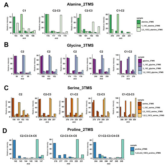 Identification of carbons contained in the mass fragments. (A) Alanine_2TMS, (B) glycine_3TMS, (C) serine_3TMS, and (D) proline_2TMS. The presence of 13C atoms from the original metabolite introduced mass shifts in the fragments of the TMS derivative analyzed.
