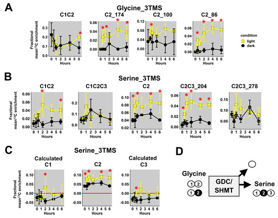 13C-positional enrichment analysis of glycine and serine during U-13C-pyruvate incorporation into B. napus leaf discs in light and dark conditions. (A) Glycine_3TMS, (B) serine_3TMS, (C) calculated positions for serine_3TMS, and (D) metabolic explanation. Black points, dark conditions; yellow points, light conditions. Values represent the mean ± SD for four biological replicates. Statistical differences between light and dark conditions are denoted with red stars according to a Wilcoxon–Mann–Whitney test (*, p-value < 0.05). The complete dataset is available in Table S2.