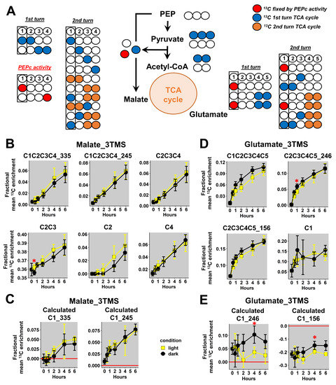 13C-positional enrichment analysis of malate and glutamate during U-13C-pyruvate incorporation into B. napus leaf discs in light and dark conditions. (A) Metabolic network and possible isotopologues, (B) malate_3TMS, (C) calculated positions for malate_3TMS, (D) glutamate_3TMS, and (E) calculated positions for glutamate_3TMS. Black points, dark conditions; yellow points, light conditions. Values represent the mean ± SD for four biological replicates. Statistical differences between light and dark conditions are denoted with red stars according to a Wilcoxon–Mann–Whitney test (*, p-value < 0.05). The complete dataset is available in Table S2.