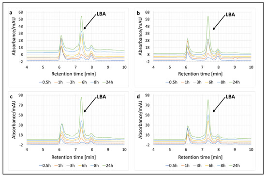 Moreover, quantitative analysis of the LBA formed in the reaction was also carried out by HPLC chromatography at different incubation times under two temperature conditions (Figure 3).
