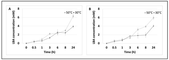 As shown in Figure 3, the concentration of LBA started to increase rapidly at 8 h of incubation. In both enzyme systems, the maximum conversion efficiency relative to the initial substrate concentration (lactose) was about 8% LBA at 30 °C and about 12% LBA at 50 °C. The highest concentration of sLBA was recorded after 24 h and was about 4 mM at 30 °C and about 6 mM at 50 °C regardless of the systems tested.