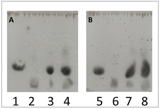 Qualitative study of lactobionic acid using the TLC method. Samples containing a redox mediator (ABTS (A) or DCPIP (B)) incubated at two different temperatures (30 °C or 50 °C) were used for the analysis. Lane 3 (30 °C) and 4 (50 °C) were samples with ABTS (A), while lane 7 (30 °C) and 8 (50 °C) represented those with DCPIP (B). Control samples were cLBA at a concentration of 20 mM (lanes 2 and 6) and 25 mM lactose in acetate buffer (lanes 1 and 5). After the stain analysis, the presence of both lactose (the oxidized substrate) and lactobionic acid (the product of the enzymatic reaction) was confirmed in the control samples.