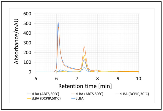 Two enzyme systems were tested first, one containing the cellobiose dehydrogenase (PlCDH) enzyme and lactose and the other containing two enzymes (PlCDH and laccase (CuLAC)) and lactose. We based this experiment on our previous study, but made some modifications [20]. Originally, we wanted to determine the effect of incubation time on the amount of LBA produced. The enzyme systems were tested at two temperatures of 30 °C and 50 °C. The incubation was carried out for 24 h and samples were taken for analysis after 0.5 h, 1 h, 3 h, 6 h, 8 h, and 24 h. Using HPLC chromatography, the presence of lactobionic acid in the tested sample was confirmed (Figure 2).