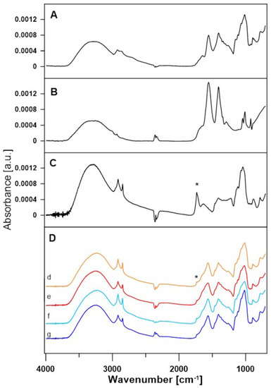 FTIR spectra of lactose (A), acetate buffer (B) and lactobionic acid (C). (D) Comparison of FTIR spectra of A30 (d), A50 (e), D30 (f), and D50 (g) samples after enzymatic reaction. An asterisk marks 1735 cm−1 band of the C=Oacid bond.