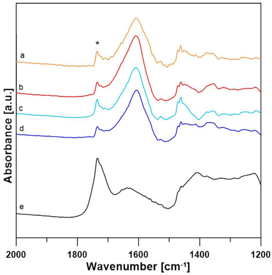 Comparison of sample-lactose differential spectra of A30 (a), A50 (b), D30 (c), D50 (d) and pure LBA (e). An asterisk * marks 1735 cm−1 band of the C=Oacid bond.