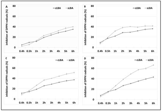 The antioxidant properties of the LBA contained in the reaction mixture were assessed using the DPPH antioxidant activity assay. A commercial LBA (cLBA) reagent was used as a control at the same concentrations as in the samples tested. The results are shown in the figure below (Figure 9).