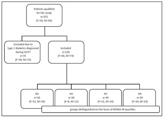 The including criteria were: no previous diagnosis of diabetes and current fasting glucose <7.0 mmol/L, no contraindications to performing the oral glucose tolerance test (OGTT), C-reactive protein (CRP) concentration in blood <10 mg/L, and no pathological results of routine laboratory tests (i.e., basic hematology tests, liver, and kidney function tests). One hundred fifty-five subjects were initially qualified for the study on the basis of physical examination and medical documentation. Thirty-five of them were excluded because they were newly diagnosed with type 2 diabetes based on the results of the OGTT performed in the study. Finally, 120 adults (46 women and 74 men), who used no medication, no supplements, no special diet, and no alcohol, were included in the study. The flowchart of patient recruitment for the study is presented in Figure 1.