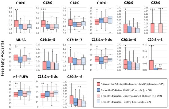 - Smit, E.N.; Dijkstra, J.M.; Schnater, T.A.; Seerat, E.; Muskiet, F.A.; Boersma, E.R. Effects of malnutrition on the erythrocyte fatty acid composition and plasma vitamin E levels of Pakistani children. Acta Paediatr. 1997, 86, 690–695. [Google Scholar] [CrossRef]