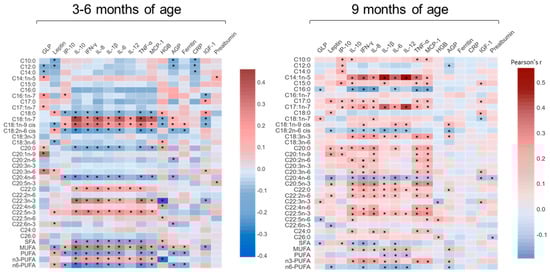 | C14:0 | 3–6 M | 385 | −0.080 | (−0.179, 0.020) | 0.115 | −0.134 | (−0.231, −0.035) | 0.008 | −0.130 | (−0.227, −0.030) | 0.011 |