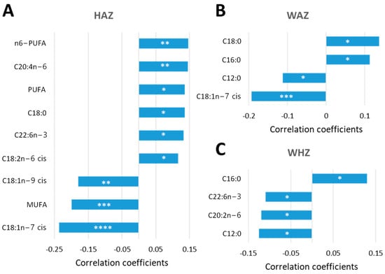 | C10:0 | 3–6 M | 385 | −0.162 | (−0.258, −0.063) | 0.001 | −0.036 | (−0.136, 0.064) | 0.484 | −0.107 | (−0.205, −0.007) | 0.036 |