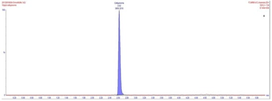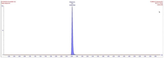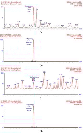 In many studies, before developing a suitable analytical method, it is necessary to comprehensively consider that milk contains lipids, proteins, minerals, and other substances that may interfere with the detection of cefquinome [36,37]. The compounds’ quantitative analysis is compromised by an endogenous origin substance in LC-MS with an electro spray ionization source that can severely influence it at trace levels, and can thus influence the method accuracy greatly. To assess the effect of the cow’s milk matrix on cefquinome, chromatograms of blank milk matrix sample supplemented with cefquinome (25 μg·kg−1) were compared with chromatograms of blank mobile phase sample spiked with cefquinome (25 μg·kg−1), reconstituted in the same mobile phase (Figure 2). When the value of ME is between −20% and 20%, it shows a weak matrix effect. When the value of ME is <−20% or the value of ME > 20%, it shows a strong matrix effect [30,38,39]. Throughout detection, undetected matrix components may have a weak or strong matrix effect strength on the analyte, and influence the accuracy and the repeatability of the analysis. In our study, ME was calculated as −12%, −12% was between −20% and 20%, and a weak matrix effect was produced when cefquinome was detected in milk (Figure 2). The obtained matrix effect results show that calibration curves using a matrix matching calibration curve play an important role in complex cow’s milk matrices to determine cefquinome content. Matrix interferences that are detected in cow’s milk can be minimized utilizing matrix-matched calibration standards. These results suggest that this method is appropriate for detecting cefquinome residues in cow’s milk samples.