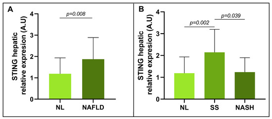 3.5. Correlation of Relative mRNA Abundance of Hepatic STING with Clinical and Biochemical NAFLD-Related Features