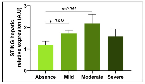3.2. Evaluation of the Relative mRNA Abundance of STING in Relation to Hepatic Histology