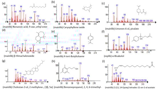Representing the mass spectrum of Nonanoic acid, 9-oxo-, ethyl ester with RT= 33.692 (a), Caryophyllene oxide with retention time (RT) =35.706 (b), Limonen-6-ol, pivalate with RT = 36.06 (c), β- Himachaleoxide with RT = 36.39 (d), 4-tert-Butyltoluene with RT = 36.853 (e), α-Bisabolol with RT = 37.276 (f), Cholestan-3-ol, 2-methylene-, (3β, 5α) with RT = 36.325 (g), Benzenepropanol, 2, 4, 6-trimethyl- with RT =36.942 (h), and Z-(13,14-Epoxy) tetradec-11-en-1-ol acetate with RT = 36.613 (i).