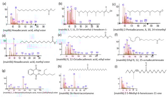 Representing the mass spectrum of Hexadecanoic acid, ethyl ester with RT = 41.613 (a), 3, 7, 11, 15 -Tetramethyl-2-hexadecen-1-ol with RT = 41.140 (b), 2-Pentadecanone, 6, 10, 14-trimethyl- with RT = 41.303 (c), Hexadecanoic acid, methyl ester with RT = 43.470 (d), 9,12-Octa decadienoic acid, ethyl ester with RT = 54.297 (e), Ethyl 9,12,15-octadecatrienoate with RT = 54.767 (f), 1,2-Benzenedicarboxylic acid, mono(2-ethylhexyl) ester with RT = 80.831 (g), 16-Hentriacontanone with RT = 91.164 (h), and Z-5-Methyl-6-heneicosen-11-one with RT = 92.799 (i).