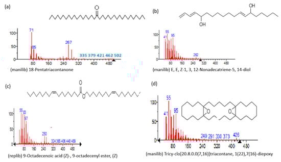Representing the mass spectrum of 18-Pentatriacontanone with RT = 96.417 (a), E, E, Z-1, 3, 12-Nonadecatriene-5,14-diol with RT = 99.402 (b), 9-Octadecenoic acid (Z)-, 9-octadecenyl ester, (Z) - with RT = 103.82 (c), and Tricyclo [20.8.0.0(7, 16)] triacontane, 1(22), 7(16)-diepoxy- with RT = 104.247 (d).