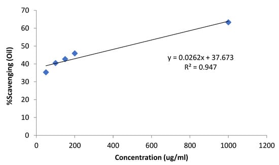 In the antioxidant assay (Table 2), concentrations were taken in (µg/mL), starting from 50, 100, 150, 200, and 1000 and shows the values in Figure 6. The values of the essential oil that were obtained are 39.3, 40.5, 42.7, 45.9, and 63.3, while the values of the standard drug (ascorbic acid) are 70.5, 73.7, 77.8, 79.4, and 87.4, based on increasing concentrations. The U. dioica essential oil showed significant DPPH scavenging activity, as compared to the standard’s ascorbic acid. The essential oil of U. dioica, at low concentration, showed no growth inhibition, while at higher concentration, it showed inhibition power. Similar activity was reported by Kukri et al., using crude extract [39]. In a recent study conducted by Chaqroune and Taleb (2022), the findings showed significant antioxidant effects of the essential oil. The methanol and ethanol were used as solvents for extraction [40,41]. These findings may correlate to this study, as essential oils have the potential to be used as antioxidant agents.