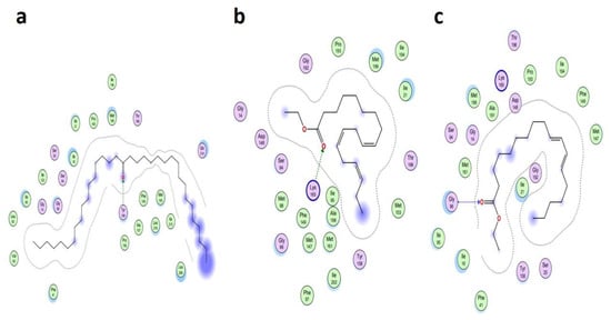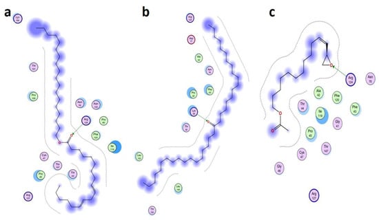 Not all the physicochemical properties of the virtual hits are in the acceptable range, and have some violations of Lipinski [42] and Veber’s [43] theory of drug-likeness because of a large MW. The lipophilicity and water solubility class also presented very good outcomes for Z-(13, 14-Epoxy) tetradec-11-en-1-ol acetate, Ethyl 9, 12, 15-octadecatrienoate, and 9, 12-Octadecadienoic acid, ethyl ester. The gastrointestinal drug absorption (GI-DA) [44] and blood–brain barrier (BBB) permeability [44] were also calculated for the selected five hits. The CYP1A2, CYP2C19, CYP2C9, CYP2D6, and CYP3A4 inhibitory potential was estimated, and it was observed that Z-(13, 14-Epoxy) tetradec-11-en-1-ol acetate, Ethyl 9, 12, 15-octadecatrienoate, and 9, 12-Octadecadienoic acid, ethyl ester is CYP1A2 and CYP2C9 inhibitors, although both compounds, 9-Octadecenoic acid (Z)-, 9-octadecenyl ester, (Z) and 18-Pentatriacontanone are P-glycoprotein (P-gp) substrates. The Log Kp (skin permeation) values were high for all the hits, and the PAINS alert and Brenk alert that were supported by the medicinal chemistry parameter evaluation [30] showed minor violations, which provides suggestions to improve the structures’ functionality and activity before moving a drug to the next phase of development. Synthetically, all the hits were highly accessible, with high scores, although minor toxicity was presented for one hit, Z-(13, 14-Epoxy) tetradec-11-en-1-ol acetate. Hence, the selected hits presented moderate drug-like activities.