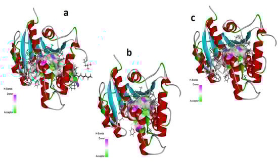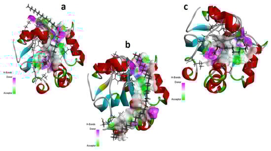 Hydrogen bonding capacity of top three scored docked ligands CID_10440 (a), CID_5367460 (b), and CID_22371644 (c), within the active site of antibacterial protein [PDB ID: 4TZK]. Purple colored area presents the hydrogen bond donor capacity and the green colored area presents the hydrogen bond acceptor capacity.