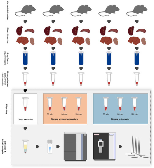 Overview of the sampling procedure, creation of biological replicates, and experimental setup. Five mice were sacrificed via cervical dislocation and heart, spleen, liver, and kidney samples were immediately dissected afterwards. Tissue samples were snap-frozen in liquid nitrogen and stored at −80 °C until further processing. Samples were then homogenized via wet bead milling using 25% ethanol + 10 µM indometacin as extraction solvent. After the storage of tissue homogenates at different conditions for varying periods, they were subjected to liquid–liquid extraction and were analyzed in a randomized order via ultra-high-performance liquid chromatography-high-resolution mass spectrometry (UHPLC-HRMS). Storage conditions: 1. Direct extraction after tissue homogenization (t0); 2. Storage at room temperature (RT) for max. 120 min; 3. Storage in ice water (IW) for max. 120 min.