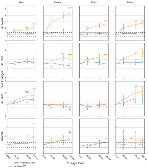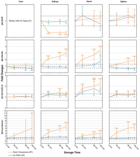 Lipid class ratios of homogenized liver, kidney, heart, and spleen samples either stored at room temperature (RT) or in ice water (IW) for specified times. Tissue types are organized in columns and lipid class ratios are depicted in the following rows: (A) LPI/PI; (B) LPG/PG; (C) LPC-O/PC-O; (D) Cer/HexCer. The results are shown as fold changes of the ratios relative to their initial values at 0 min. Dashed lines indicate a relative lipid class ratio increase and decrease of 30%. Error bars represent corresponding standard deviations. Results are shown for lipids that passed additional filter criteria with the only exception of LPI/PI liver data, as no LPIs remained after filtering. * p < 0.05, ** p < 0.01, *** p < 0.001, and **** p < 0.0001 (see Section 2.7). Cer: ceramides; HexCer: hexosylceramides; LPC-O: ether-linked lysophosphatidylcholines; LPG: lysophosphatidylglycerols; LPI: lysophosphatidylinositols; PC-O: ether-linked phosphatidylcholines; PG: phosphatidylglycerols; PI: phosphatidylinositols.