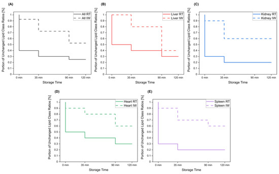The portion of lipid class ratios that remained unchanged (<30% relative change compared to direct extraction) after storage of tissue homogenates for specified times at room temperature and in ice water. All investigated lipid class ratios were considered. Results are shown for (A) all investigated tissue homogenates, as well as for (B) liver, (C) kidney, (D) heart, and (E) spleen homogenates.
