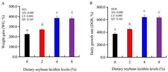 Effect of dietary soybean lecithin on weight gain (%) (A) and daily growth rate (%) (B) of juvenile largemouth bass. Bars with different letters indicate significant differences (p < 0.05), while that with the same letter or no letter superscripts indicate no significant differences (p > 0.05), AN: ANOVA, LT: linear trend, QT: quadratic trend.