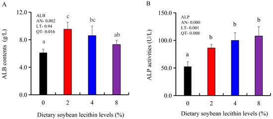 Effect of dietary soybean lecithin on serum albumin (ALB) contents (A) and alkaline phosphatase (ALP) activities (B) of juvenile largemouth bass. Bars with different letters indicate significant differences (p < 0.05), while that with the same letter or no letter superscripts indicate no significant differences (p > 0.05), AN: ANOVA, LT: linear trend, QT: quadratic trend.