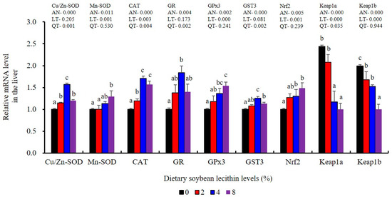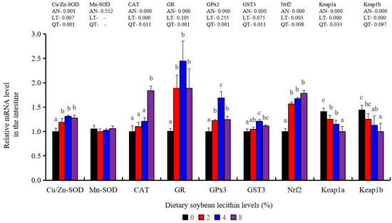 Effect of dietary soybean lecithin on expression levels of antioxidant-related genes in the intestine of juvenile largemouth bass. Bars with different letters indicate significant differences (p < 0.05), while that with the same letter or no letter superscripts indicate no significant differences (p > 0.05), AN: ANOVA, LT: linear trend, QT: quadratic trend.