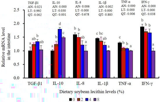 Effect of dietary soybean lecithin on relative gene expression levels of anti-inflammatory and pro-inflammatory cytokines in the intestine of juvenile largemouth bass. Bars with different letters indicate significant differences (p < 0.05), while that with the same letter or no letter superscripts indicate no significant differences (p > 0.05), AN: ANOVA, LT: linear trend, QT: quadratic trend.