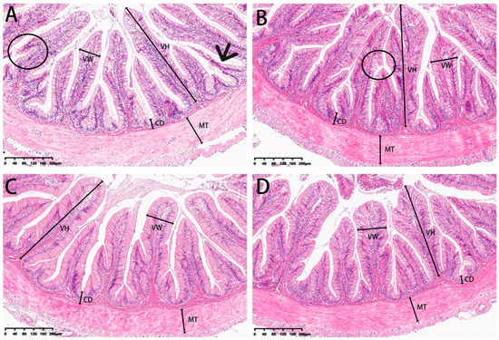 HE staining of the intestine sections of juvenile largemouth bass fed with diets containing 0% (A), 2% (B), 4% (C) and 8% (D) SBL (magnification × 100). VH: villus height, VW: villus width, MT: muscular thickness, CD: crypt depth. Circles represent intestinal villi fall off. Black arrow represents villous atrophy.