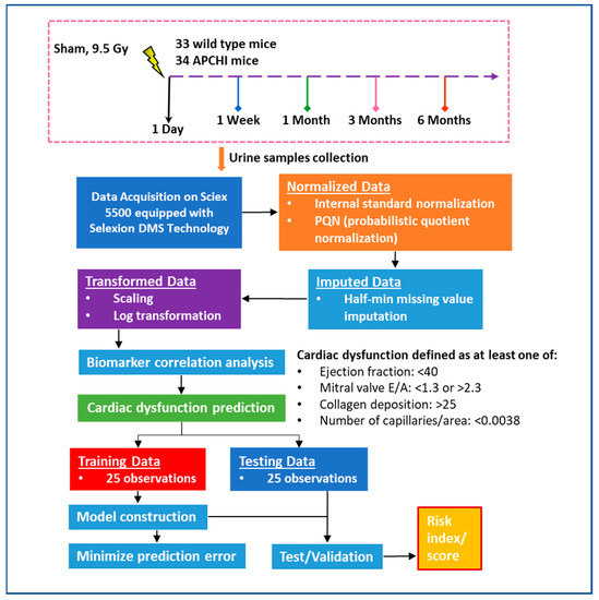 In previous studies, we have demonstrated IR-induced perturbations in plasma, plasma-derived extra-cellular vesicles, and tissue samples using LC-MS-based metabolomics [16,17,18,19]. The present study was designed with several objectives: firstly to identify the metabolic consequences of irradiation and to identify the impact of genotype as well as sex on radiation response over time. Additionally, to assess the feasibility of using urine me-tabolites as predictive biomarkers, we performed correlative analyses of metabolomics data with heart dysfunction indicators (increased collagen deposition, reduced capil-lary density, reduced ejection fraction, and/or altered mitral valve E/A ratio) as deter-mined by histology and cardiac ultrasound at 6 months post-irradiation. We posit that a metabolomics-based molecular phenotyping approach could be used as a predictive tool to pre-emptively identify individuals at risk of radiation-induced organ injury. To our knowledge, this is the first study to develop a urine metabolomics-based prediction model for radiation-induced cardiac injury using a logistic regression model. The workflow of the study is illustrated in Figure 1.
