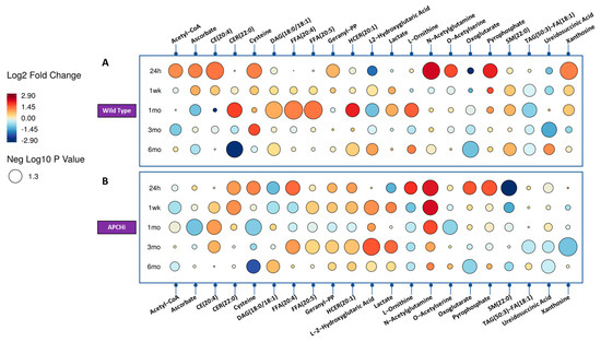 Raindrop illustration of metabolites altered in urine at different time points in Wild Type (Panel A) and APCHi (Panel B) mice. The colors of each circle represent fold change, with red representing an increase and blue representing a decrease. The size of the circle represents the level of statistical significance, with larger circles indicating greater statistical significance.
