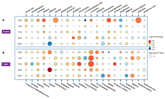 Radiation effect of mice for significantly dysregulated biomarkers across time. (Panel A) showing the female mice radiation response and (Panel B) shows the male mice radiation effect. Each circle in the figure denotes a fold change, where red indicates an increase and blue indicates a decrease. The size of each circle corresponds to the level of statistical significance, with larger circles indicating greater statistical significance.