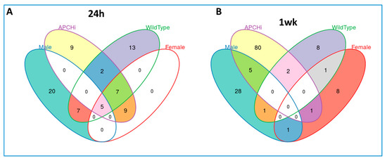 Next, we sought to investigate the effect of radiation on urinary metabolic profiles considering sex as a biological variable. A Venn diagram detailing the unique biomarkers of radiation response specific to each group, comparing radiation to sham, dependent and independent of sex and genotype, 24 h and 1 week after irradiation, is shown in Figure 3 and Figure 4.
