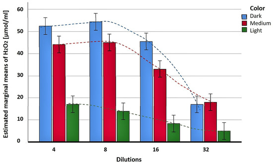 The content of H2O2 produced in dark-, medium- and light- color in honeys (columns). The non-linear relationship between the production of H2O2 and honey dilution is presented as the inverted U- shaped curve (dotted lines).