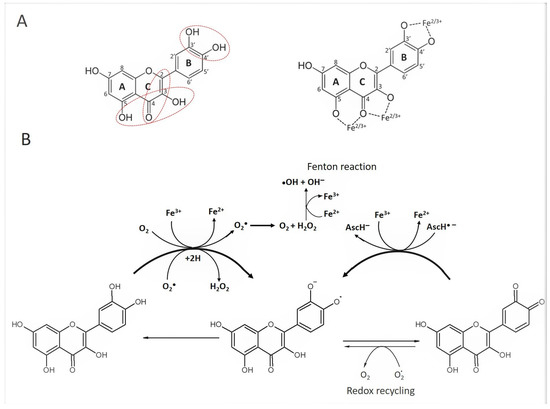 In comparison to EDTA, ascorbic acid is a weaker chelator of metal ions. However, its presence in the redox cycling reaction adds to the pro-oxidant activity of polyphenols in a dual way. Firstly, one-electron transfer from ascorbic acid to Fe3+ leads to its reduction to Fe2+ and subsequent participation in the Fenton reaction. Secondly, by donating one electron to Fe3+, ascorbic acid is oxidized to an ascorbate radical anion that can react with the flavonoid quinone to produce semiquinone radicals (Figure 2B), perpetuating redox cycling [96]. Thus, although flavonoids can act as pro-oxidants alone by reducing Fe3+ to Fe2+ or Cu2+ to Cu+ and initiating the Fenton reaction, the “help” of other reducing agents such as ascorbate radicals or superoxide radical anions (O2•−) that support the regeneration of quinone can promote redox cycling (Figure 2) [84].