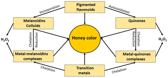 A diagram representing honey color as the direct result of the combine effect of the content of the color-impending compounds (flavonoids, quinones, transition metals) and the color-developing reactions (polyphenol autooxidation, quinone-protein conjugation, metal- quinone complexes, Maillard reactions and the formation of melanoidins and colloidal particles) and its indirect association with H2O2 production.