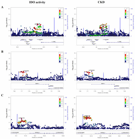 Regional association plots of IDO activity and CKD at 3p24.2 (A), 6p24.3 (B) and 8p21.3 (C) loci. Statistical significances of SNPs near NKIRAS1, BMP6, and SH2D4A for IDO activity and CKD are plotted as −log10 p-values. The purple diamond (◆) represents the SNP strongly involved in both CKD and IDO activity. Levels of linkage disequilibrium (r2) of top SNPs and surrounding SNPs are shown in different colors. These regional plots for SNPs were generated via LocusZoom(http://locuszoom.org/ (accessed on 10 March 2023)). IDO, indoleamine 2,3-dioxygenase; CKD, chronic kidney disease.