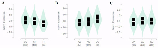 Identification of NKIRAS1 and SH2D4A expression and rs6550842 (A) and rs35651150 (B,C) in eQTL, respectively. Violin plots show NKIRAS1 expression in cultured fibroblasts for the rs6550842 genotype ((A), effect size = −0.12, p = 7.3 × 10−5). The SH2D4A expression for the rs35651150 genotype in the cerebellum ((B), effect size = 0.37, p = 1.3 × 10−5) and thyroid ((C), effect size = 0.19, p = 7.7 × 10−9) was confirmed and statistically significant. Mean expression levels are indicated by the white line and 25% and 75% quantiles are shown by the black box. Data were obtained via GTEx browser (https://gtexportal.org/ (accessed on 10 March 2023)).