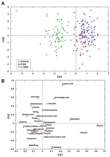 The examination of the weights plot (Figure 2B) allows identifying the variables that mostly contributed to the differentiation among the three classes of participants and their relationships. To simplify, variables lying farthest from the origin are those contributing the most to the definition of the CVs and, therefore, to sample discrimination. Variables lying close to one another are positively correlated, while those lying on the opposite side of the plot with respect to the origin are negatively correlated. The simultaneous inspection of scores (Figure 2A) and weights plots (Figure 2A) makes it possible to associate discrimination between participant classes with differences in concentrations of specific analytes, which are therefore the most distinctive. Participants that occupy a position in the scores plot where one or a group of variables lies in the corresponding weights plot have the highest value(s) of this(ese) variable(s). Accordingly, participants with F-T2DM showed higher levels of 3-methylhistidine, alanine, arginine, ethanolamine, and glutamic acid. PF&S and control participants were discriminated based on serum concentrations of aminoadipic acid, aspartate, cystine, taurine, and tryptophan (Figure S1).