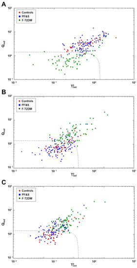 Participant classification according to serum amino acid profiles based on soft independent modeling of class analogies analysis. Projection of the outer loop sample onto the space identified by the values of and for the class models: (A) pre-frailty/frailty with type 2 diabetes mellitus (F-T2DM); (B) physical frailty and sarcopenia (PF&S); and (C) controls.