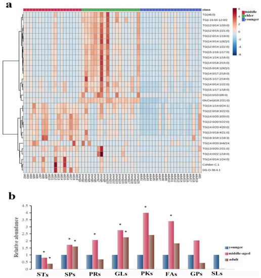 (a): The distribution of the important individual lipid species responsible for the discrimination of samples. (b) Comparison of relative abundance of differentiated metabolites of SSL in different age groups. The sign of * indicates that the difference is statistically significant when compared with the younger group (p < 0.05).