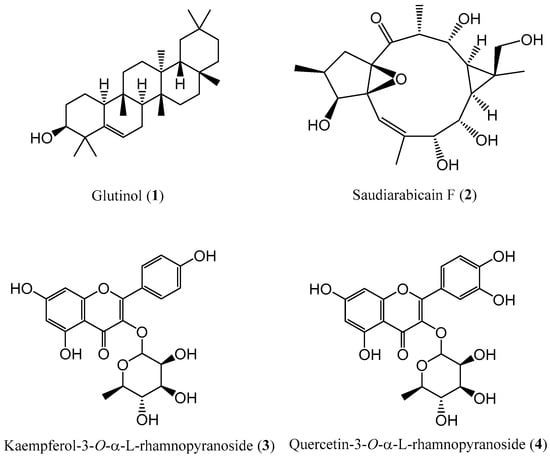 The phytochemical investigation of the MeOH extracts from the aerial parts of the E. saudiarabica resulted in the isolation and characterization of one compound from the CHCl3 fraction and three secondary metabolites from the EtOAc fraction (Figure 1). Their chemical structures were established using NMR and MS, as well as a comparison with data obtained from the available literature. Specifically, the obtained compounds were a triterpenoid derivative, a macrocyclic ingol-type diterpenoid and two flavonoids, which are here reported in this plant species for the first time and in agreement with the chemotaxonomic profile of the genus Euphorbia. Among these constituents, saudiarabicain F (2) represents a rare class of C-19 oxidized ingol-type diterpenoid, which was undescribed previously.