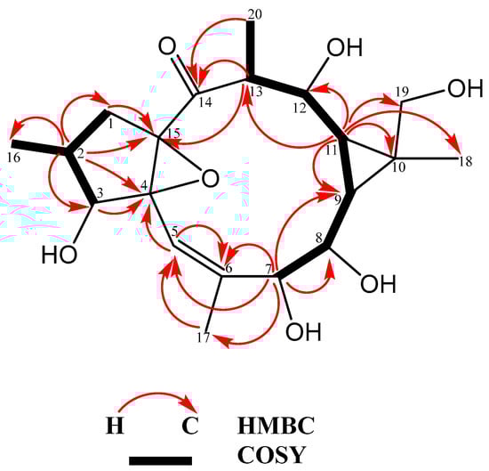 Saudiarabicain F (2): amorphous white powder; MS/ESI: m/z 382.1979, calculated for C20H30O7, 405.1890 [M+Na]+; 1H NMR data (500 MHz, DMSO-d6) δH (ppm): 2.54 (1H, dd, H-1a), 1.47 (1H, d, H-1b), 2.12 (1H, m, H-2), 4.21 (1H, d, H-3), 5.60 (1H, s, H-5), 3.93 (1H, d, H-7), 3.32 (1H, dd, H-8), 1.18 (1H, dd, H-9), 0.69 (1H, dd, H-11), 3.34 (1H, dd, H-12), 2.67 (1H, dq, H-13), 0.89 (3H, d, H-16), 1.83 (3H, d, H-17), 1.07 (3H, s, H-18), 3.58 (1H, d, H-19a), 3.51 (1H, d, H-19b), 1.01 (3H, d, H-20); 13C NMR (125 MHz, DMSO-d6) δc (ppm): 31.33 (C-1), 30.87 (C-2), 74.85 (C-3), 76.11 (C-4), 116.63 (C-5), 141.64 (C-6), 77.69 (C-7), 69.21 (C-8), 27.84 (C-9), 23.20 (C-10), 33.66 (C-11), 68.34 (C-12), 42.69 (C-13), 210.73 (C-14), 71.51 (C-15), 17.19 (C-16), 17.87 (C-17), 25.57 (C-18), 63.01 (C-19), 13.93 (C-20). The NMR data were similar to saudiarabicain E reported in the literature, with hyrdroxy rather than benzyl and acetyl groups [20]; the compound was named saudiarabicain F. The relevant MS/ESI and 1D and 2D NMR data of saudiarabicain F are illustrated in the Supplementary Material (Figures S1–S6).