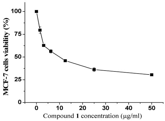Viability percentages of MCF-7 cells treated with compound 1. Cells were treated with the indicated concentration of compound 1 for 48 h and their viability was assessed by MTT assay. Results are expressed as Avg ± SD of three experiments.