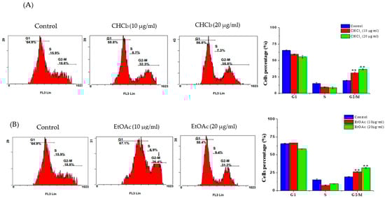 Cell-cycle progression of MCF-7 cells after exposure to (A) CHCl3 and (B) EtOAc fractions of E. saudiarabica. The MCF-7 cells were treated with 10- and 20-μg/mL concentrations for 24 h and the distribution of cells in various stages was evaluated by measuring DNA content. Results showed that both fractions induced G2/M cell-cycle arrest in a dose-dependent manner. The experiments were performed in triplicate. Data are reported as Avg ± SD. ** p ≤ 0.01 vs. control.