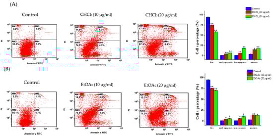 Effects of E. saudiarabica CHCl3 and EtOAc fractions on stages of apoptosis. (A) The MCF-7 cells were incubated with 10 and 20 μg/mL of CHCl3 fraction for 24 h and were then collected and stained with Annexin V/PI, followed by FACS analysis. The bars display FACS-quantification analysis. (B) The FACS and bar graphs showing the percentages of MCF-7 cells treated with 10 and 20 μg/mL of CHCl3 fraction for 24 h. Data are mean ± SEM of three independent experiments, where * denotes p ≤ 0.05 and ** denotes p ≤ 0.01 vs. control, as measured by Student’s t-test.